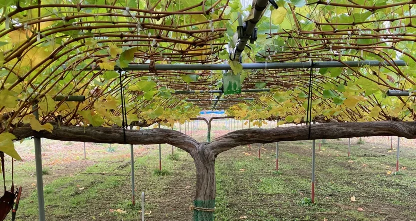 V字型棚仕立短梢剪定栽培を視察、ぶどう棚の設計図をいただき、当園のぶどう棚の設計に活かされる。