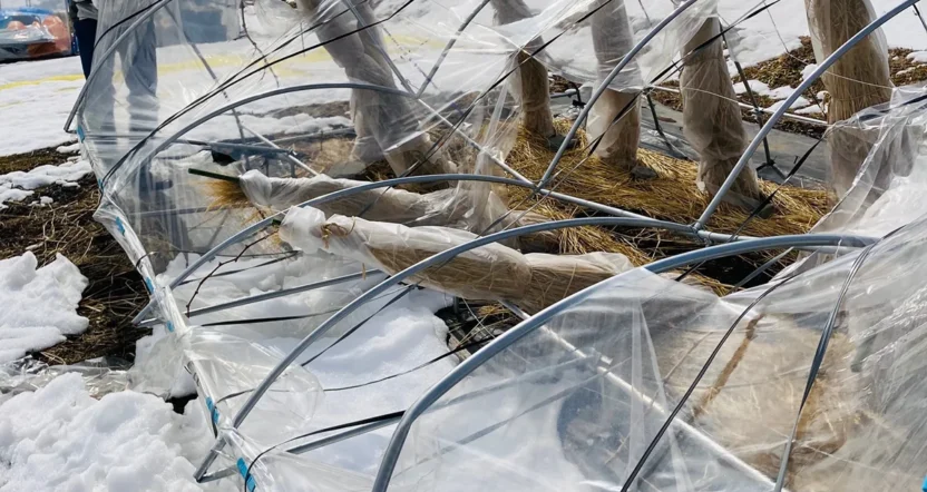 大雪の影響で仮植え苗の雨除け倒壊