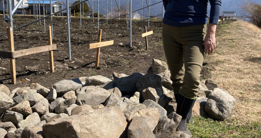圃場から出た大量の石を撤去 2023年3月25日 元々、河原だった圃場から大きな石がゴロゴロ出てきて流石にびっくり! 写真に写っているのはごく一部。げんこつサイズの石はまだ圃場内には大量に残ったまま。 植物の根は土中の石に当たると細根を増やし植物ホルモンを活性化すると言われており、ぶどうが元気に育つ秘訣はこうした石にあるかもしれない。