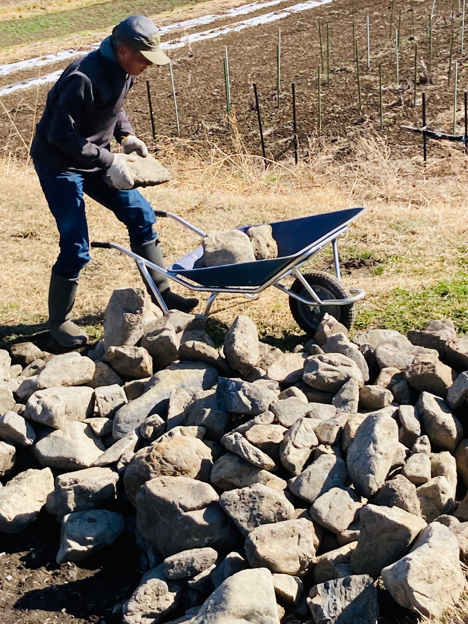 そこは「石間(いしま)」と呼ばれる元々は河原だった土地で、当初はスコップやアースオーガーさえ跳ね返す石だらけの荒れ地に途方に暮れ、コツコツと石を拾い続けるだけの日々でした。