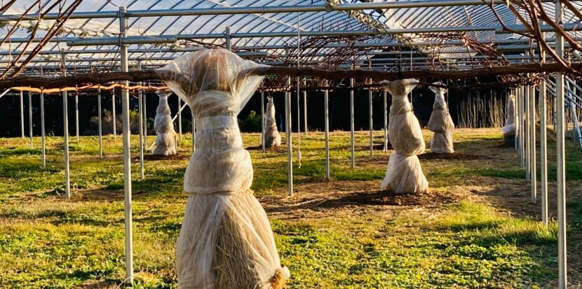 マイナス10度を下回る厳しい冬、ぶどうは葉を落とし、わらを身にまとって静かな休眠の時を過ごします。